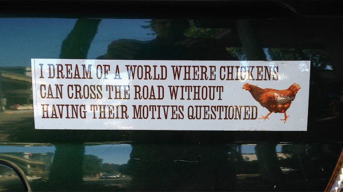 Even chickens have feelings February 9, 2015 Steve Random Shots 0 Click here to enlarge image. 2010sAuto cultureBumper stickersHuman-nature interactionParody