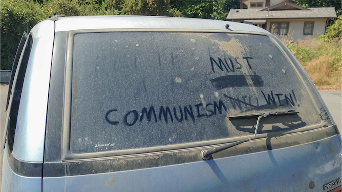 Someone near Lake Quinault (Wikipedia, 2020) wanted you to know that “Communism will win!” But then someone else presumably thought that slogan didn’t quite hit the right tone. So they scratched out “will” and added “must.” Okay, then.