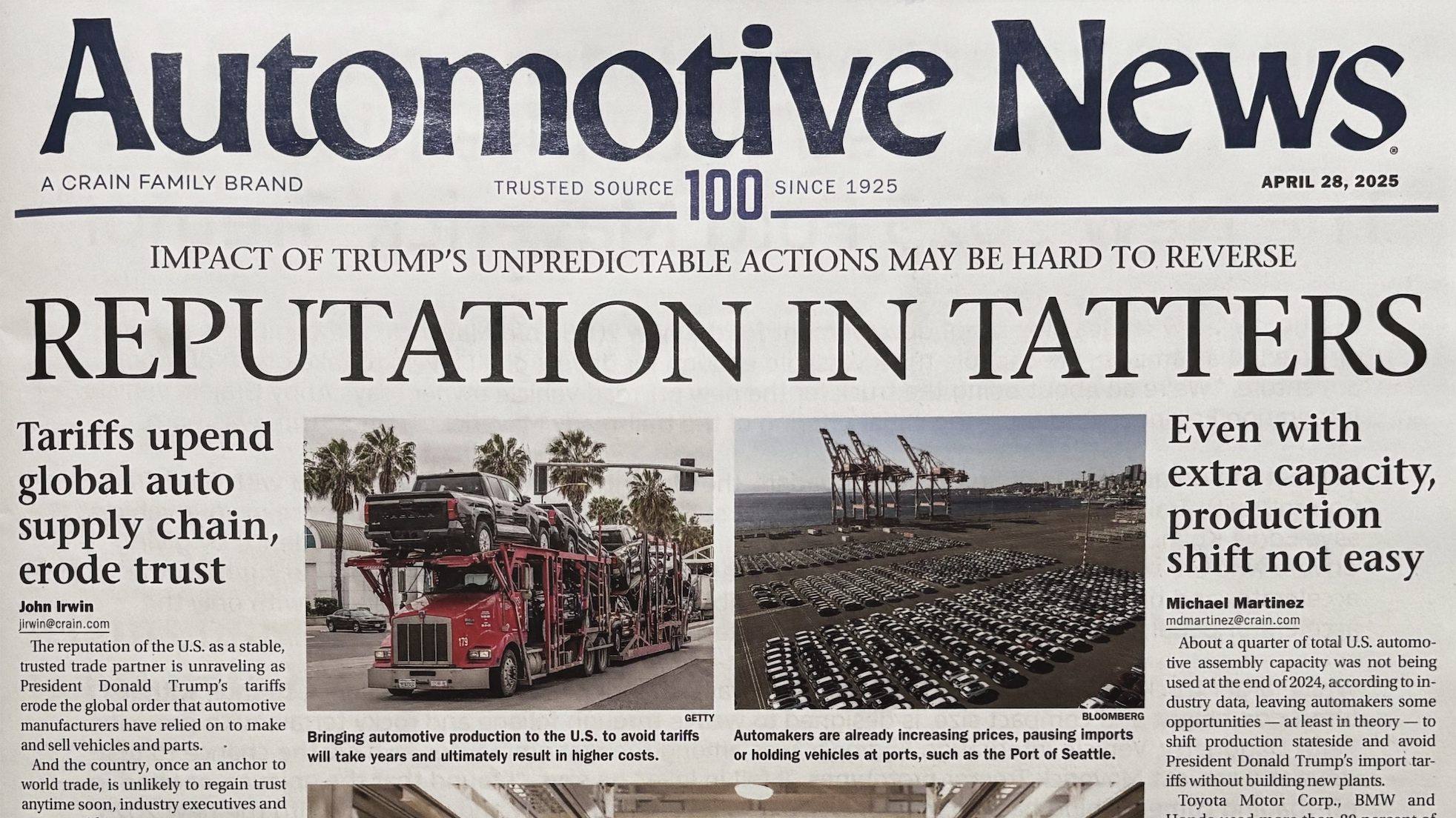 Automotive News’ April 28 front page reminded me of a daily newspaper announcing the start of a war. Rather than the usual assortment of product launches and resume-polishing profiles of auto executives, the industry journal instead ran a banner headline that shouted: “Reputation in tatters: Impact of Trump’s unpredictable actions may be hard to reverse.”