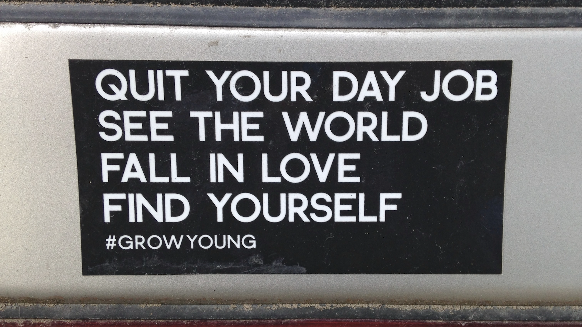 As our banner photo shows more clearly, you are also advised to “quit your day job . . . find yourself.”