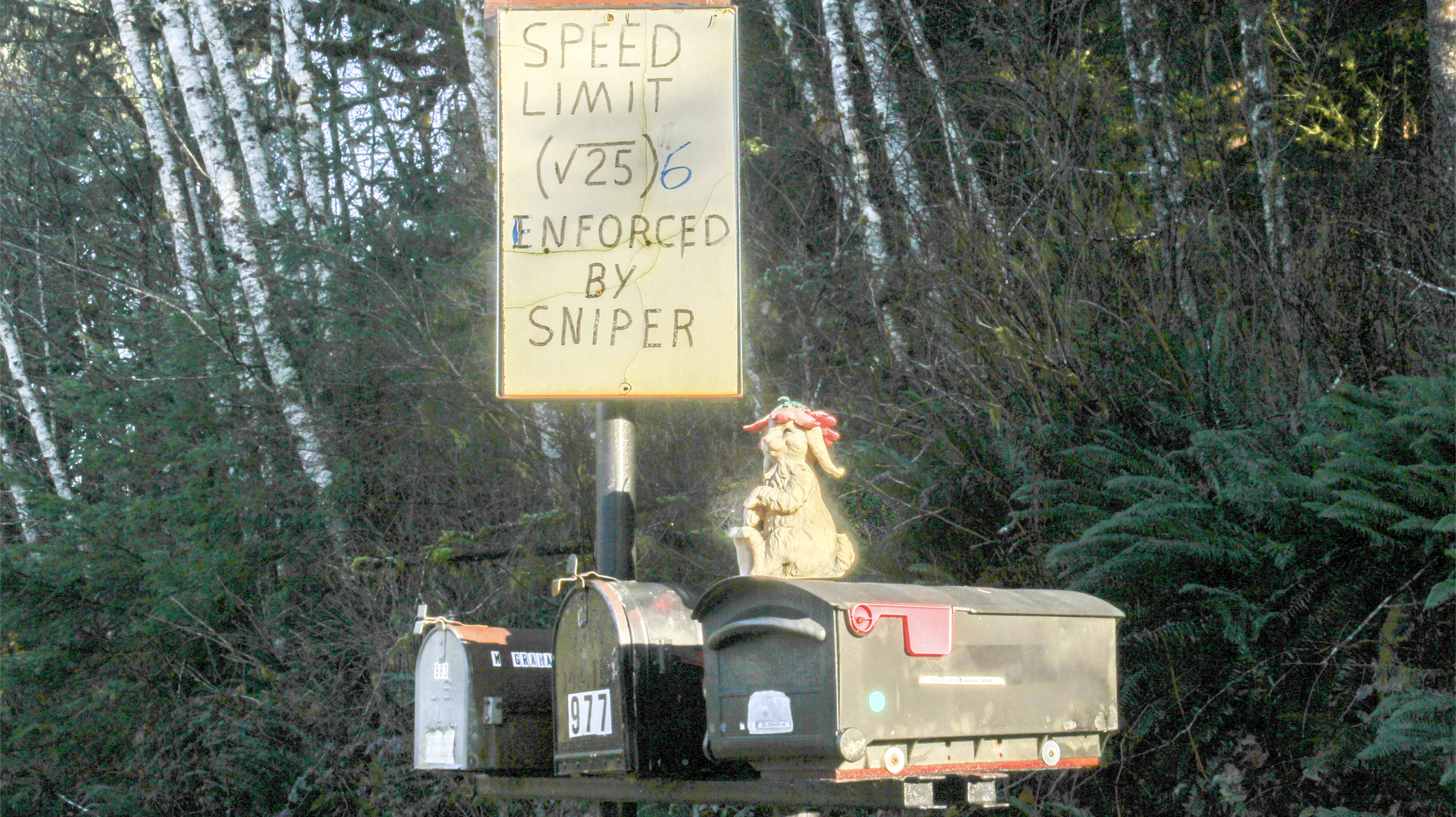 When driving up the Quinault River Valley last summer I came across a homemade “go-slow” sign that was unusually clever. Not only that, but a pond on one side of the road was decorated with a variety of humorous items.